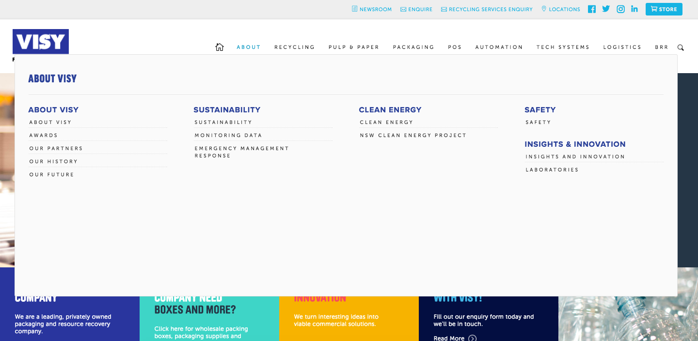 The new mega menu also easily integrates and incorporates the Product Catalog we developed for Visy - combining the brochure driven website with the full catalogue of Visy’s products. Have a look for yourself: https://www.visy.com.au/